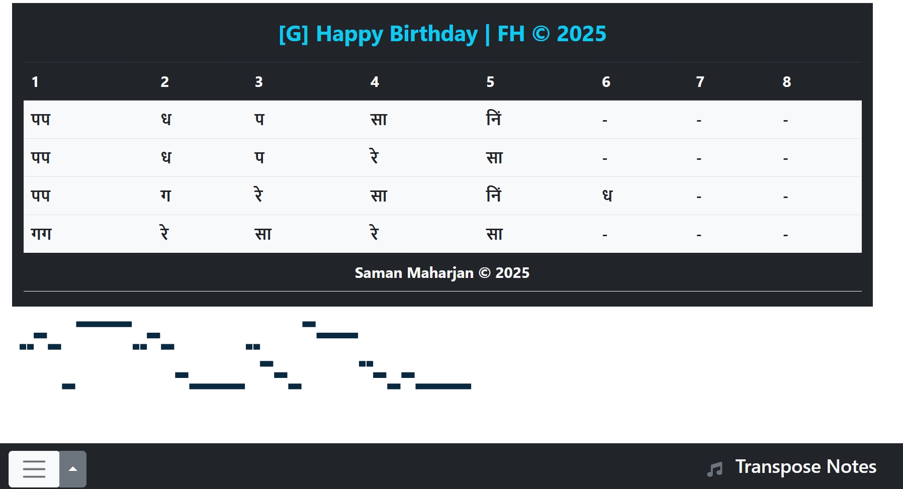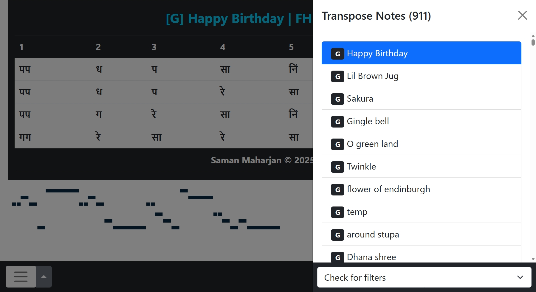 Transpose Notes allows a user to view the notation in devnagiri form and also transpose the notes from one scale to another. The notation is in bhatkhande style.